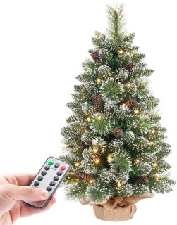 De boom is uitgerust met warmwitte LED-lampjes (20 lampjes bij 40 cm / 50 lampjes bij 70 cm) die op 3x AA-batterijen werken (niet inbegrepen). Zonder snoer plaatst u de boom waar u wilt — van bijzettafel tot bureau. De handige timerfunctie schakelt de verlichting automatisch 6 uur aan en 18 uur uit, zodat u elke dag zorgeloos van de kerstverlichting geniet. Daarnaast beschikt de boom over een knipperfunctie voor een speels lichtaccent.