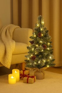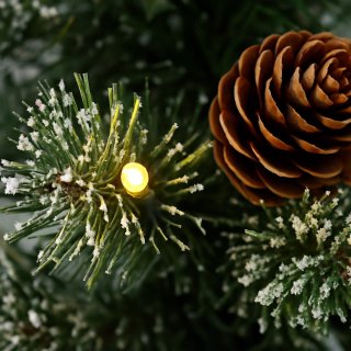 De takken zijn licht bestoven met witte sneeuw en versierd met dennenappels voor een authentieke, winterse look. De stevige voet is bekleed met linnen stof, waardoor de boom niet alleen stabiel staat maar er ook stijlvol uitziet. Wil je meer glans? Je versiert de boom eenvoudig verder met kleine kerstballen, sterretjes of andere ornamenten.